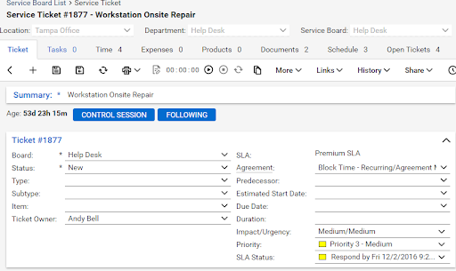 Now that the ticket has been saved, you will notice that you now have access to a variety of tabs and additional information can be added to the Service Ticket.