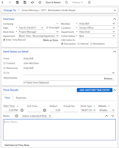 As you are working on a Service Ticket you should be updating the time spent working on that ticket, as well as entering any related expenses.